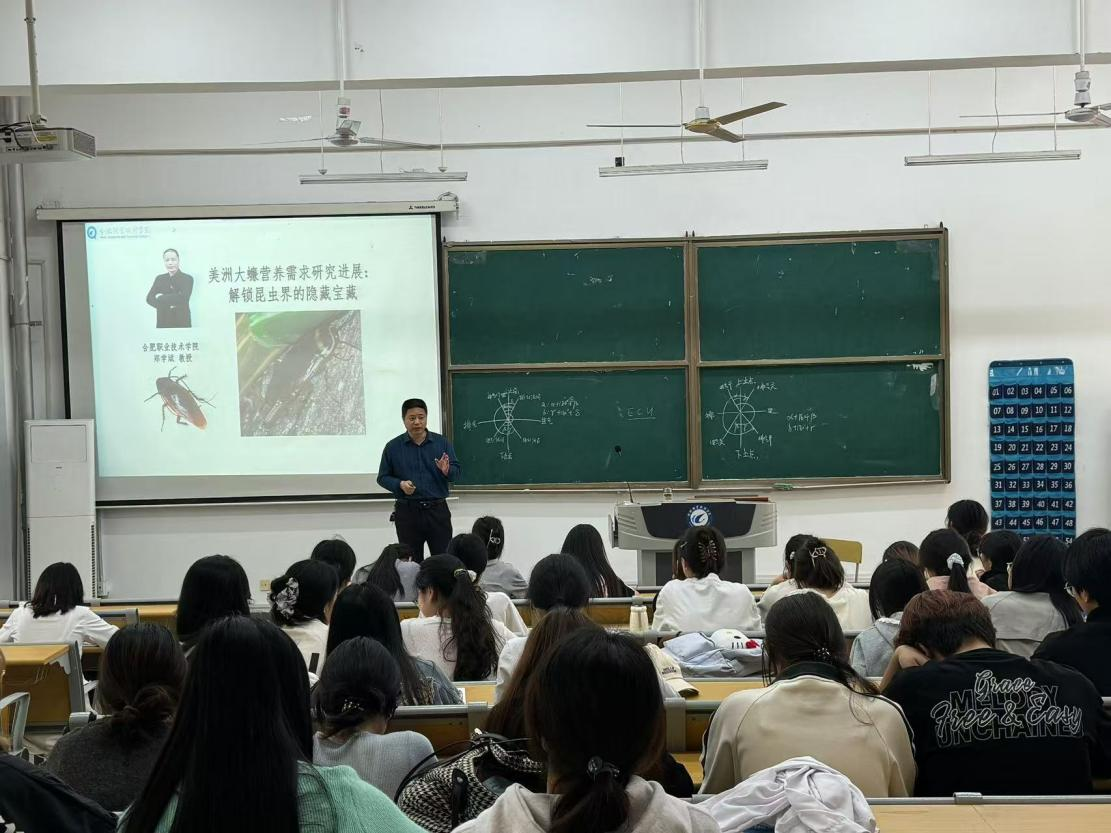 4月23日下午,生物工程学院在鼓山校区教学楼A楼一楼阶梯教室举办《美洲大蠊营养配制技术研究》专场学术交流活动,来自食品、园林、药学专业的90余名学生齐聚一堂,聆听合肥职业技术学院郑学斌教授带来的昆虫研究领域前沿分享。