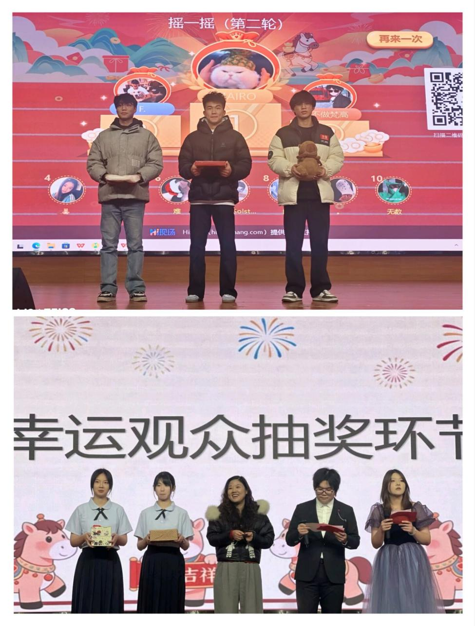晚会还设置了“趣味摇一摇”互动和幸运观众抽奖环节,台下学子踊跃参与,将现场氛围一次次推向高潮。建筑工程学院第十届学生会带来的《猪猪侠》特别节目,更是让晚会充满了欢乐的氛围。台下观众热情高涨,挥舞着手中的荧光棒,不时响起阵阵掌声与欢呼声,现场暖意融融、其乐融融,处处洋溢着喜庆祥和的节日氛围。