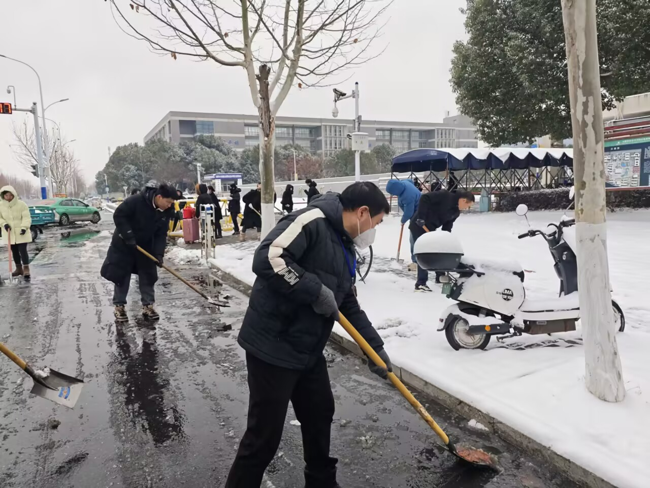 经过数小时的持续奋战,校园及凤凰山路段(校园门口至裕溪路段)的积雪积冰被基本清除,一条条“平安路”“暖心路”逐渐显现,为过往行人、车辆的安全通行提供了有力保障。