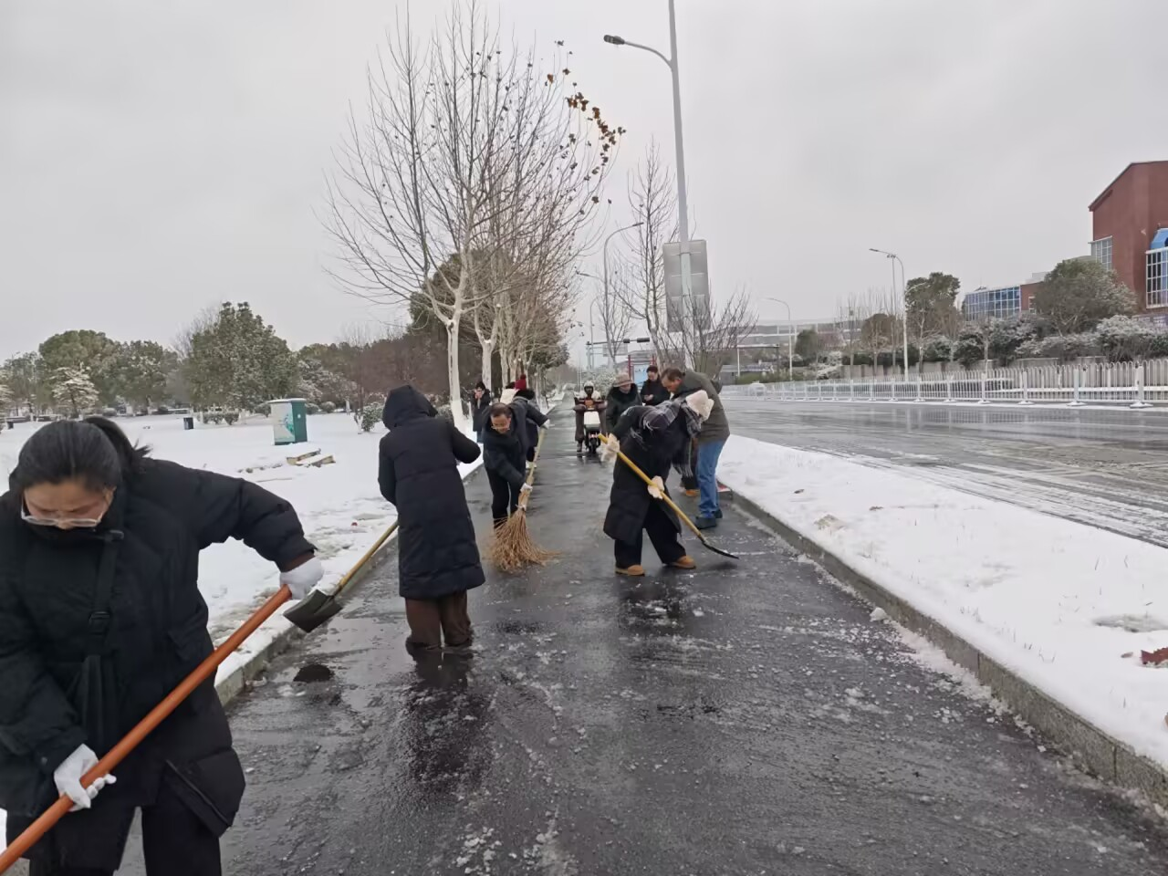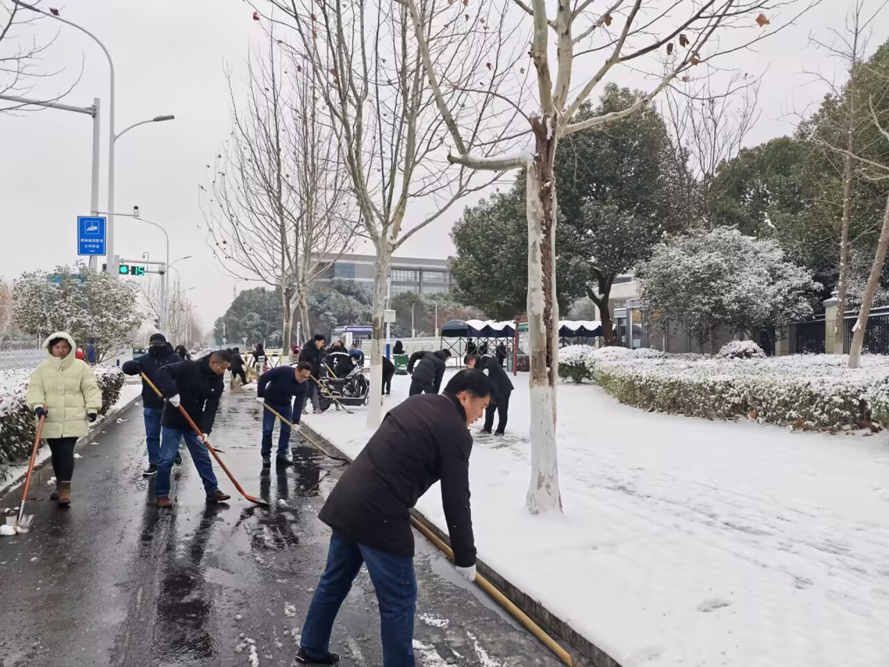 昨夜,一场降雪为城市披上银装,却也给道路交通和市民出行带来了不便。为确保校园周边道路畅通,保障附近居民及师生的出行安全,我校鼓山校区积极响应巢湖市政府号召,迅速组织教职工开展义务扫雪除冰行动。